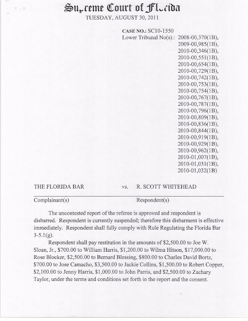 Robert Scott Whitehead, was a Destin, Florida attorney who had many pending Florida Bar Assn complaints. In the past the Bar ignored 5 complaints and only put one letter of admonition in his file. This lack of concern on the part of the Florida Bar just covered up the flaws and let a lot of people, including me, get totally screwed by this lawyer. He has now been disbarred. Details below.